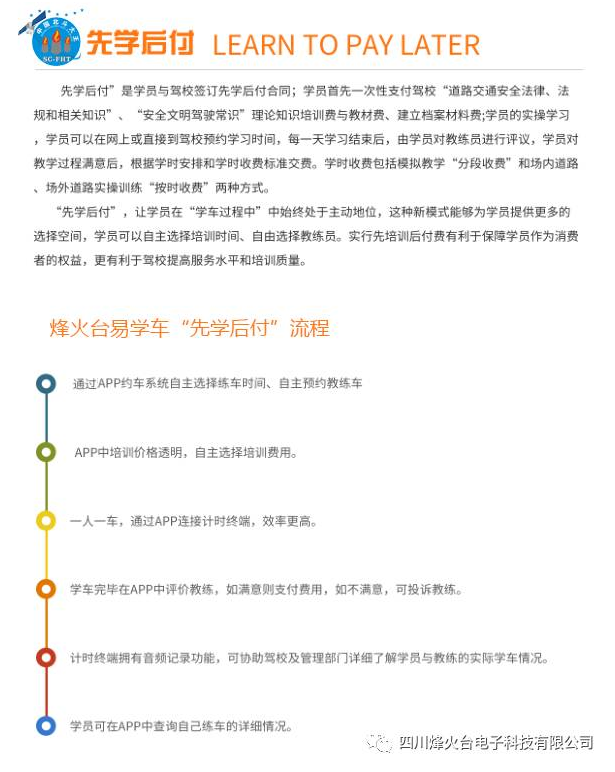 【烽火台易学车培训平台】依据公安部和运输部《驾驶员计时培训系统平台技术规范要求》,结合公司十多年计时培训模式经验,响应政府部门“自学自考”,“先学后付”等便民政策,为驾驶员培训机构及广大学车群众提供一个透明、高效、功能丰富、集成化的计时平台应用平台解决方案。